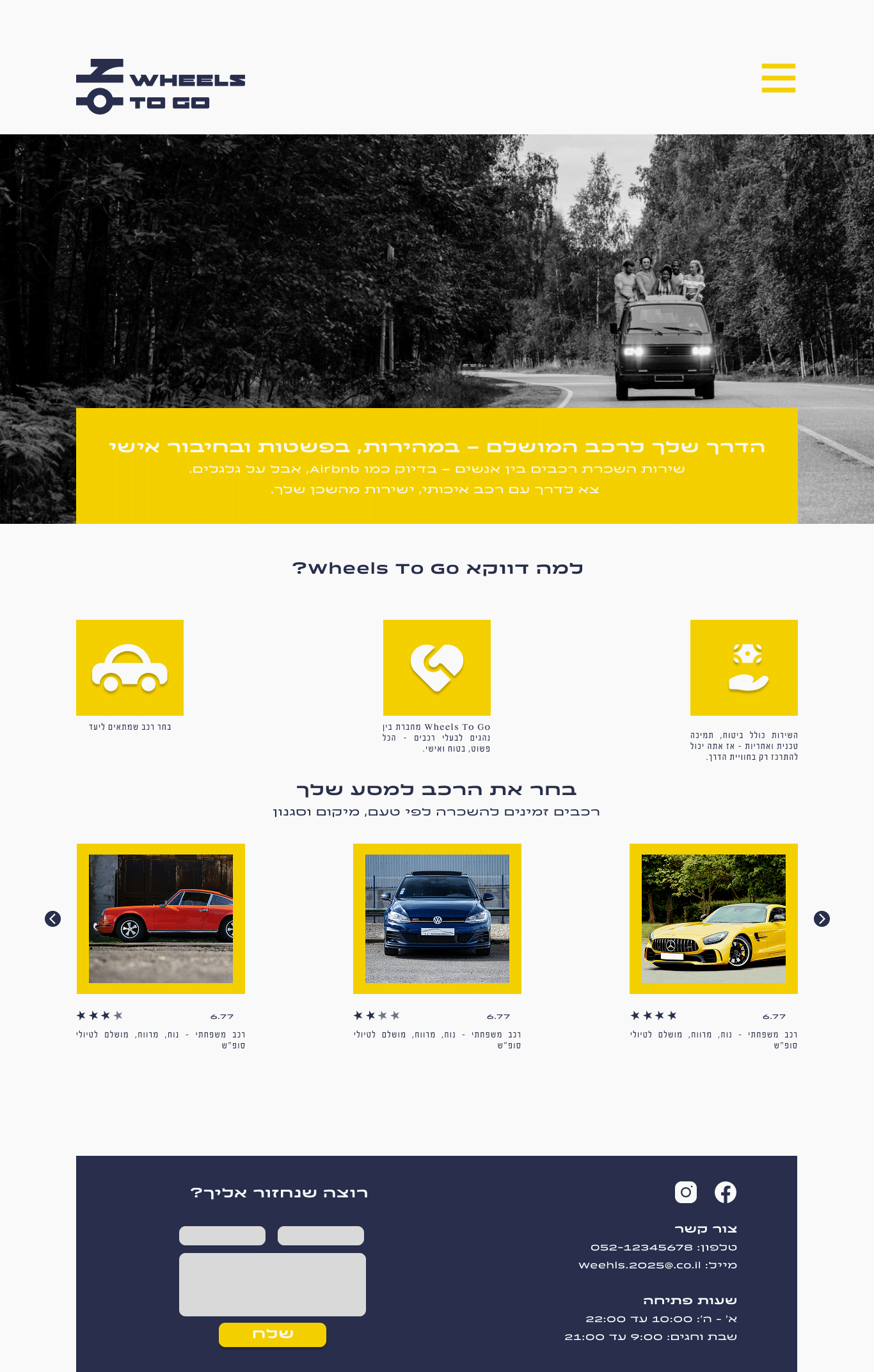 השפה העיצובית שנבחרה לאתר "Wheels To Go" נועדה לשדר שילוב בין אנושיות, נגישות ואמינות – ערכים מרכזיים בשירות המאפשר השכרת רכבים בין אנשים פרטיים. הצבע הצהוב המרכזי יוצר תחושת חופש, תנועה וקלילות, בעוד שהכחול הכהה (נייבי) מאזן ומעניק תחושת יציבות ואחריות. הפונטים שנבחרו הם מודרניים וקריאים, עם היררכיה ברורה בין כותרות לתוכן, והקונטרסט הצבעוני שומר על נגישות חזותית. השימוש בצורות עגולות ואייקונים פשוטים כמו לב, רכב וגלגל הצלה, תורם לאווירה ידידותית ובטוחה. התמונות באתר מציגות רכבים אמיתיים בסביבה טבעית ומזמינה, מה שמחזק את התחושה שהשירות נגיש ואישי. בנוסף, השפה המילולית בגובה העיניים, עם משפטים קצרים וישירים, תומכת במסר העיקרי – שירות פשוט, מהיר, ואמין, שמחבר בין אנשים בדרך חכמה ונעימה.